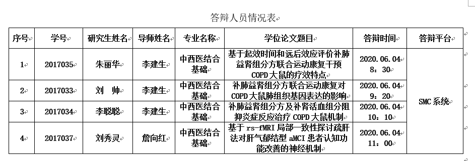 基础医学院硕士研究生第四组(中西医结合基础专业)于2020年6月4日进行学位论文答辩,欢迎参加,特此公告!