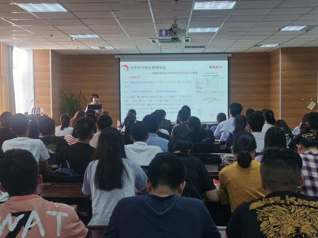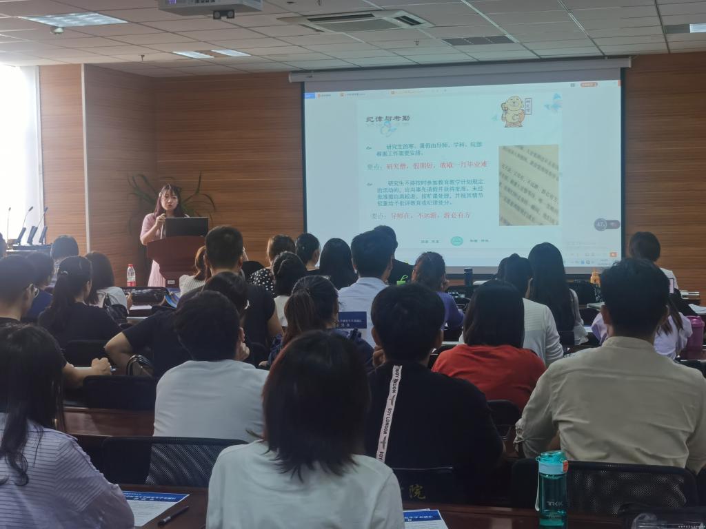 基础医学院学院研工办主任张文娴、学工办研究生辅导员刘淘淘分别就研究生培养、教育、日常管理等方面进行了详细讲解。张文娴老师从学位学分要求、学位授予条件两个方面为大家进行详细解读,嘱咐大家做好研究生三年的学业规划,把控好论文开题及论文见刊的时间节点。同时,张老师强调,为加强研究生的学术道德建设,培养良好的学术氛围,同学们要树立学术诚信意识,杜绝学术不端行为。