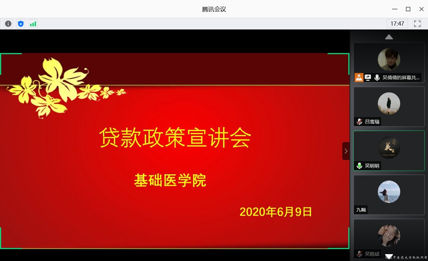 为了贯彻资助育人理念,全面宣传助学贷款政策,提高大学生诚信还贷意识,基础医学院于6月9日下午在召开毕业生贷款线上政策宣讲会,大发博彩 资助专员吴明明老师、院系学贷专员助理及2015级高校贷款毕业生参与。