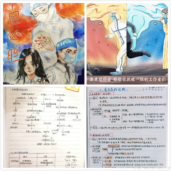 前期学院分团委老师在各微信群中广泛宣传,全面细致地向同学们介绍此活动。“医学无止境,以学展风采”活动主要通过学生分享疫情期间的学习笔记来进行。通知一经发出,同学们纷纷传来他们精选的学习笔记,其内容丰富,涉面广泛,充分展现了基础学子疫情时期勤学苦练、专心医学的积极氛围。而在“妙手丹青,抗疫共赢”书画竞赛活动中,同学们又用丰富的色彩、巧妙的构图、不同的绘画风格绘出了一幅幅栩栩如生的精美作品。大家在展示课外技能的同时也表达了对疫情防控一线人员的尊敬,让同学们感受到中国精神和中国力量,增强战胜疫情的决心和信心。