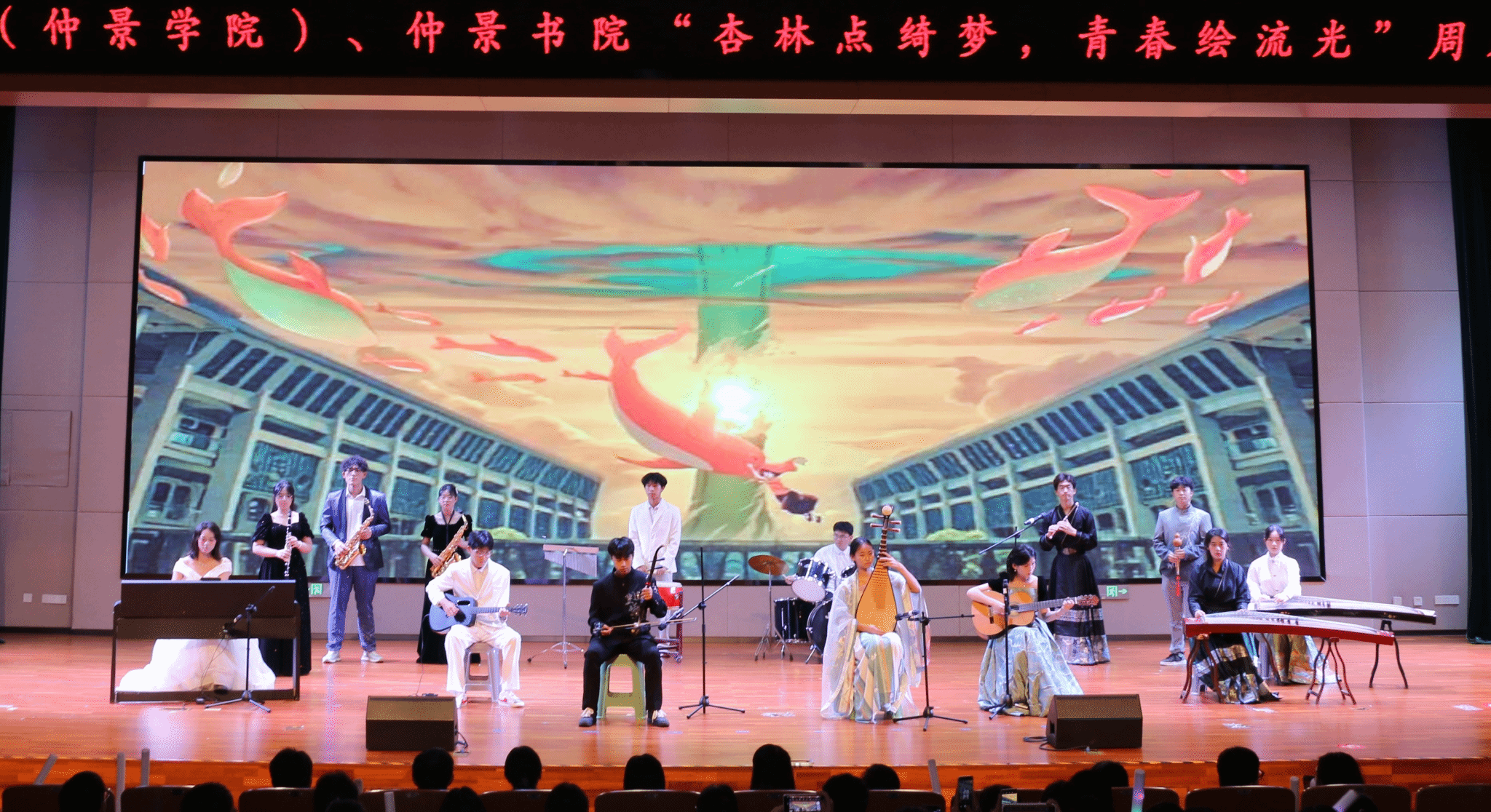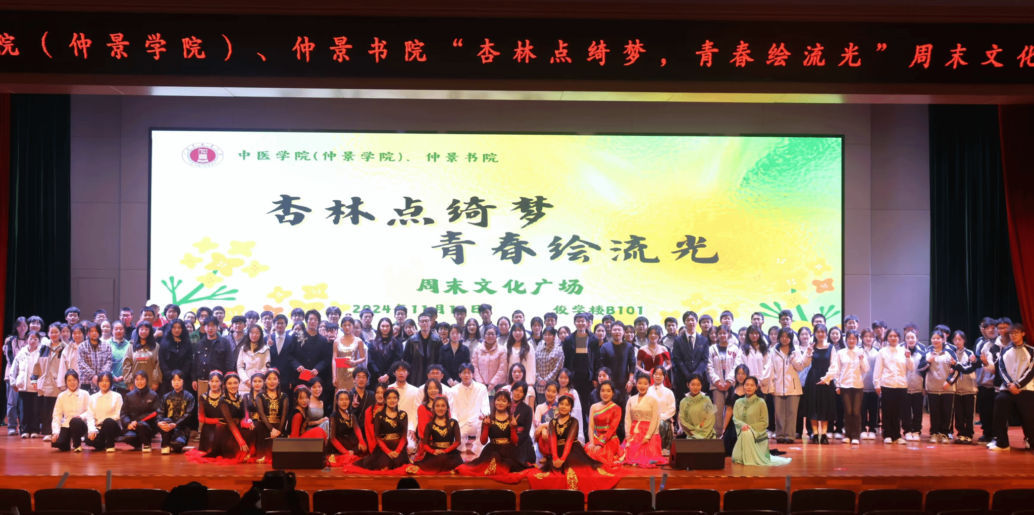 本网讯(文/图 肖天程)繁星闪闪添华彩,笑语声声颂盛情。为丰富大学生课余文化生活,展示同学们的青春活力,发挥艺术演出的美育作用,2024 年 11 月 16 日晚,大发博彩官网 “杏林点绮梦 青春绘流光 ”周末文化广场活动在俊学楼 B101 顺利举办。大发博彩官网 党委副书记朱庆军出席晚会,学院教师代表、书院育人导师以及各学院近500名同学到场观看。
