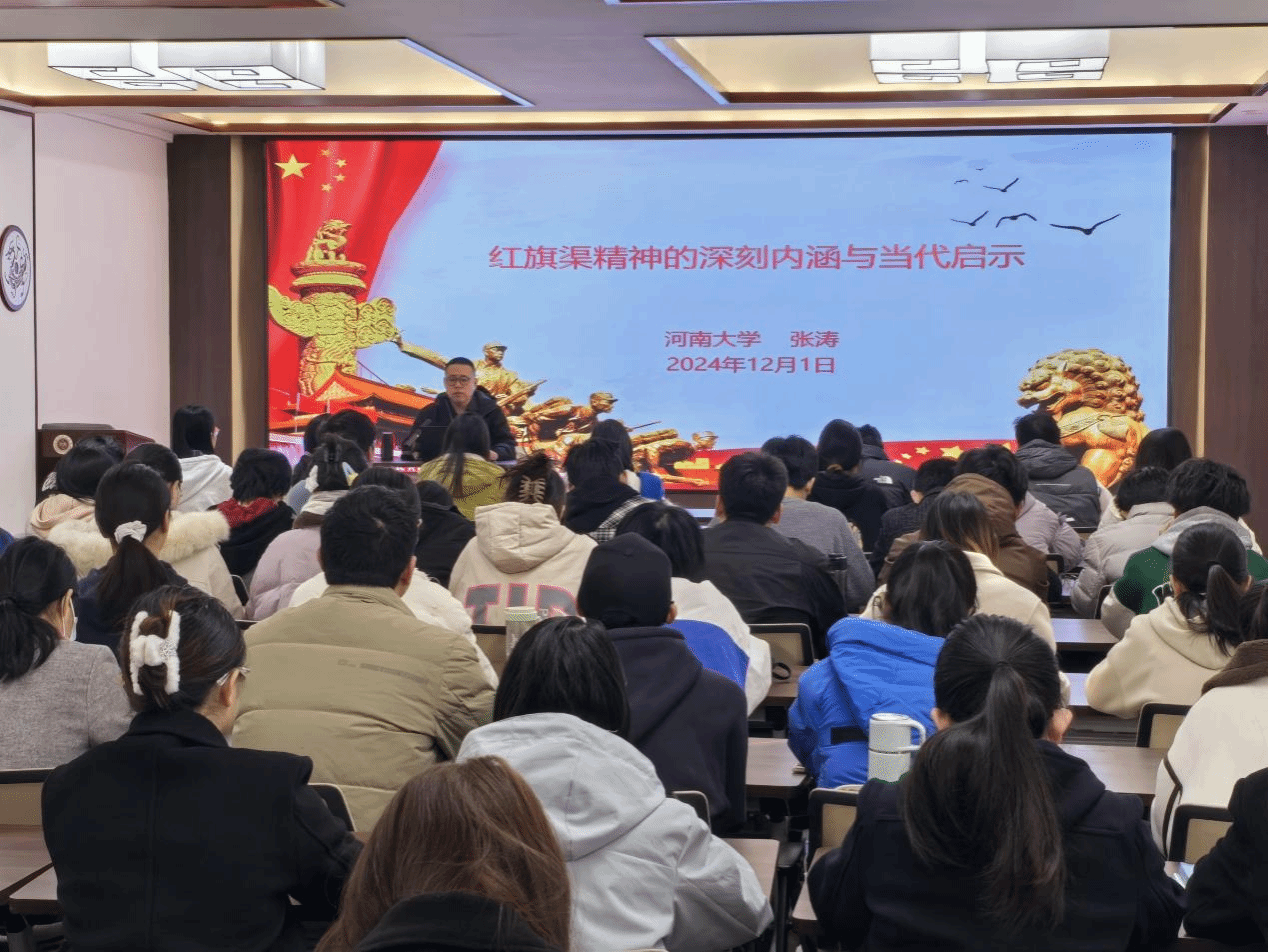 本网讯(文图/赵申苒)为深入学习贯彻中国共产党人的精神谱系传承,加强学生党员的思想教育,2024年12月1日,大发博彩官网 邀请河南大学马克思主义学院张涛副教授在12号楼大发学堂开展了一场以红旗渠精神的深刻内涵与当代启示为主题的党课。80余名学生党员参加。