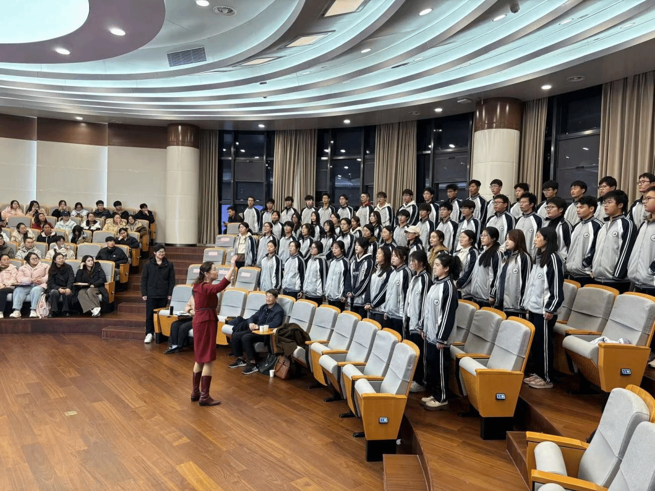 最后,程伟华老师指挥全场合唱歌曲《爱我中华》,将报告会推向高潮。整场报告会气氛热烈,掌声不断。学生们纷纷表示要珍惜来之不易的幸福生活,努力学习专业知识,积极投身社会实践,用实际行动践行红色精神。
