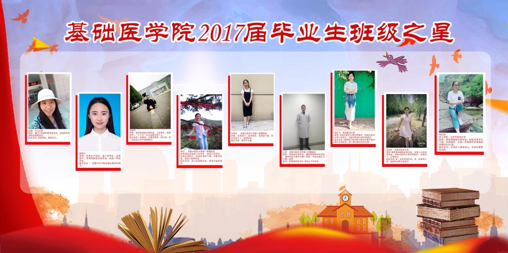 为树立基础医学院优秀的学生典型,表彰基础医学院各毕业班级先进个人,展现基础医学院毕业生风采,在学生中进一步形成崇尚先进、学习先进、争当先进的良好风气。基础医学院于6月12日-6月16日以2017届毕业生考研、就业、服务基层等多个方面内容为标准,从三个2017届毕业班中共评选出9名具有突出代表的个人作为2017届毕业生班级之星。
