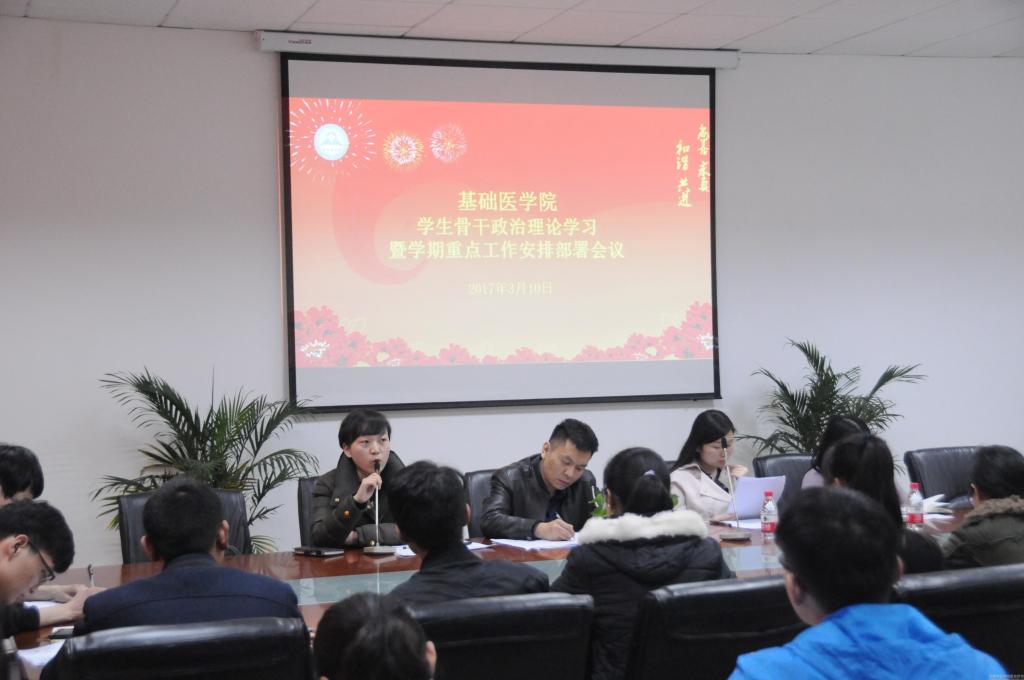 3月10日中午,基础医学院在四楼会议室召开学期重点学生工作安排部署会议暨学生骨干政治理论集中学习活动。基础医学院学工办全体辅导员,学生会、班团骨干以及各学生党支部代表参加了本次会议。