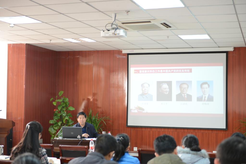 校党委副书记郭德欣同志从重视意识形态工作是中国共产党的优良传统、抓好意识形态工作是落实全面从严治党的关键、强化责任意识做好高校意识形态工作三个方面为师生进行专题辅导。他用大量详实的资料、生动的语言深刻阐释和分析了当前意识形态工作面临的形势和任务,详细讲解了加强意识形态工作的具体举措。报告旁征博引,深入浅出,既有政治高度、理论深度,又紧密结合学校实际,使大家进一步明确了责任。他强调:一是各级党委尤其是主要负责同志要种好意识形态“责任田”,要坚持社会主义人才培养和办学方向,做到“四个不”---办学方向不能偏、政治属性不能变、党的领导不能弱、根本任务不能失。二是加强对意识形态阵地的管理,要规范课堂、网络、学术交流、讲坛管理,管好阵地。三是党员教师要做好表率。要做到“两个界限清晰”---教师学术研究和遵守法律的界限,教师课堂教学与公开发表错误言论的界限;“两个底线明确”---教师遵守宪法是底线,党员遵守纪律是底线。四是自觉抵制和反对五种错误言行。