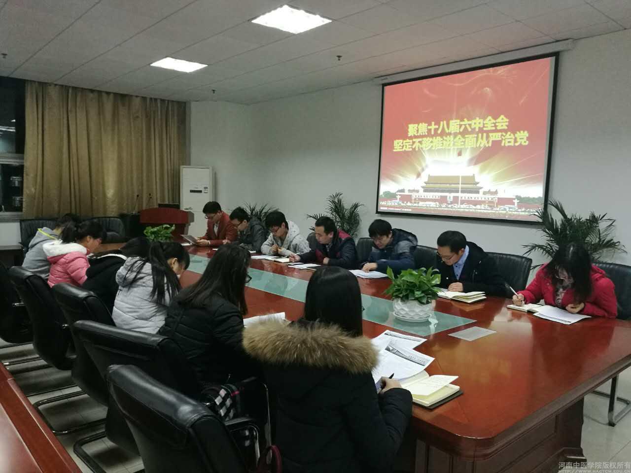 为贯彻落实党的十八届六中全会精神,深入推进“两学一做”学习教育,11月22日晚,基础医学院第三党支部召开了十八届六中全会精神专题学习交流会。会议由支部书记杨华超主持。