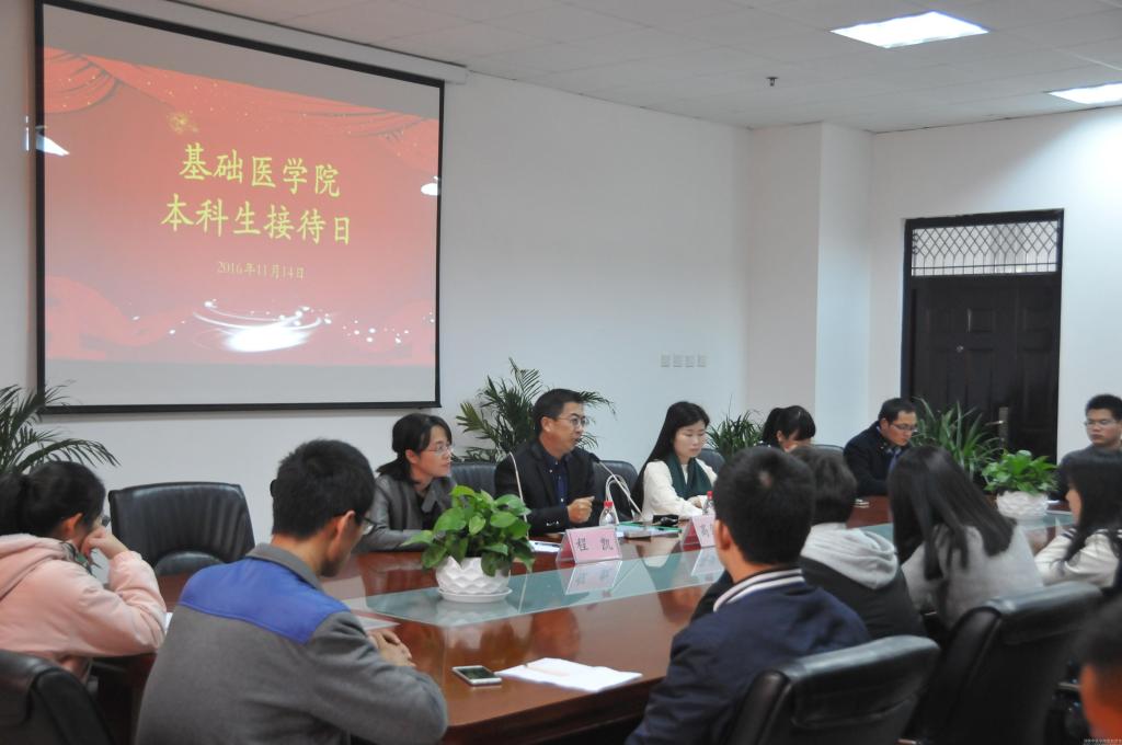 11月14日中午,基础医学院于四楼会议室开展本科生接待日活动。基础医学院副院长高剑锋、研工办主任程凯、分团委副书记刘旭初以及三位研究生代表与本科生进行了见面交流。