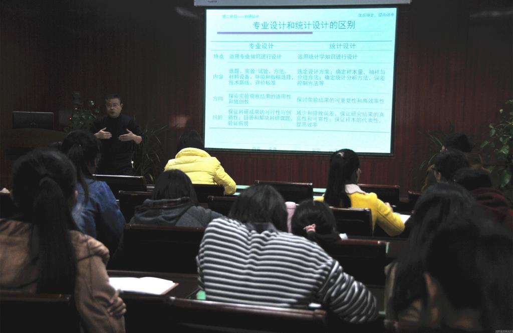 杨老师将科研一般程序分为以下五个阶段:科研选题、科研设计、组织实施、资料处理、分析总结、在前期讲授中已着重分析了科研选题,此次讲授重点为科研设计以及其中的标书立项。标书立项包括提出问题、陈述问题、撰写标题等,在此他举出“维生素C合并维生素E服用对2型糖尿病患者并发感染的影响”标题撰写的事例,启迪大家深思,并且告诫在座学生:“标题是对论文内容的精练、准确、核心的描述。”随后他讲述了科研设计中的研究设计,指出研究设计分为专业设计和统计设计。专业方面包括选题、研究方法、对象、指标等等,而统计方面则由抽样、样本、分组、分析方法等等构成。在谈及组织实施时,他强调了课题实施的原则,如充分的准备工作、制定操作流程、规范原始记录等,此外,杨老师还简略地讲解了资料处理及分析总结的一些常用方法。