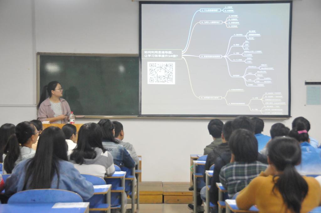 戴老师从 “什么是思维导图”、“为何要学会思维导图”、“思维导图的绘制原则”、“思维导图的应用”四方面展开阐述。思维导图是表达发散性思维的有效的图形思维工具,它运用图文并重的技巧,把各级主题的关系用相互隶属与相关的层级图表现出来,把主题关键词与图像、颜色等建立记忆链接。她强调运用思维导图可以进行课程学习、演讲、日程计划、会议安排、自我分析、单词记忆等等,并且戴老师结合自身体会告诫大家要运用有效的方法去建立自己的时间管理图,以此提高学习与工作效率。