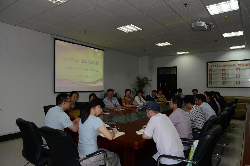 2016年7月15日上午,基础医学院围绕“不忘初心,重温入党誓词”主题,召开中心组学习交流扩大会,领导班子成员、全体支部书记参加会议,基础医学院院长詹向红同志主持会议。