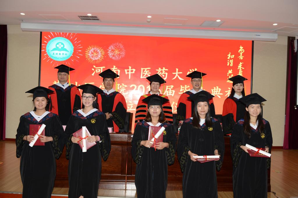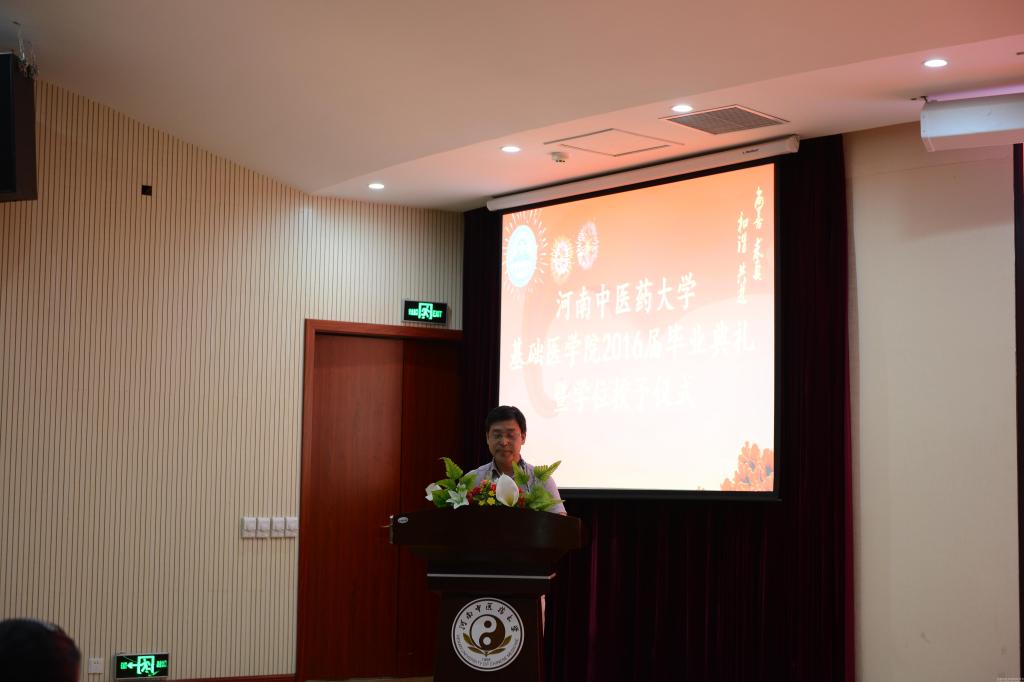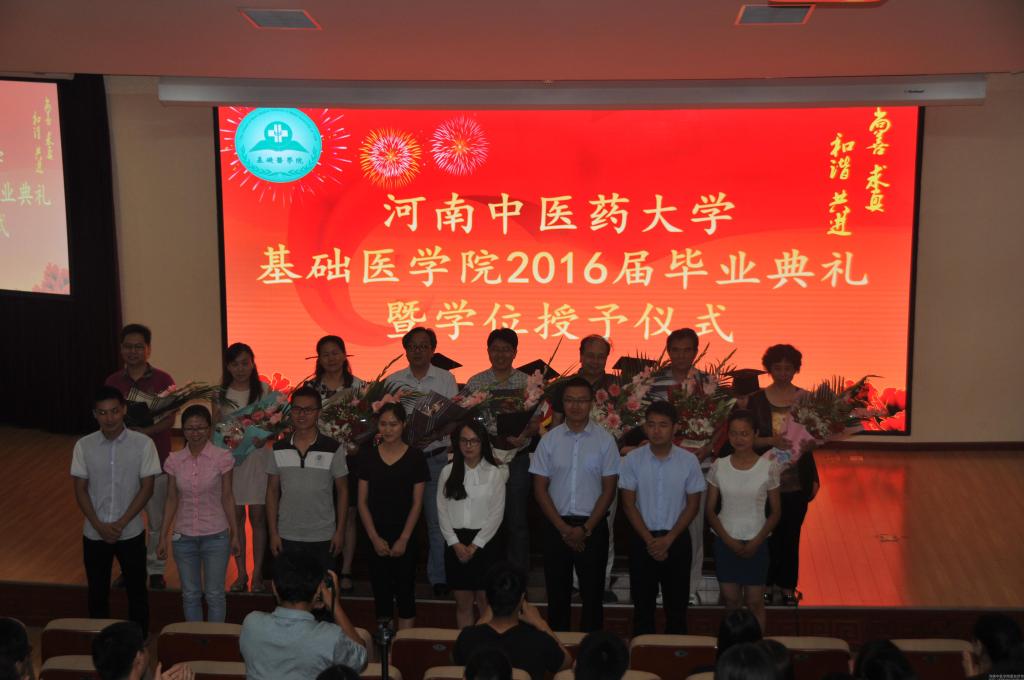 2016届优秀应届毕业生代表伊亚伟同学、往届优秀毕业生代表华润三九制药有限公司河南地区经理雷明东、教师代表中医临床基础学科谢忠礼副教授、2016届优秀毕业生家长代表陈璐同学母亲路杰女士依次上台发言,表达对学校培养的感激之情及对2016届毕业生的殷切希望。随后基础学科学位分委员会与会全体领导共同为2016届全体毕业生颁发毕业证书、学位证书、扶正流苏并合影留念。