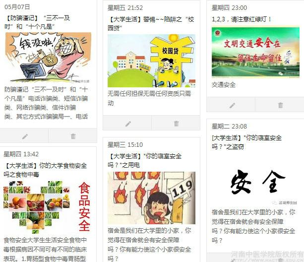 此次大学生安全教育系列活动主要从校园日常安全、用电安全、饮食安全、交通安全、网络安全、防电信诈骗和“校园贷”以及心理健康与安全等方面进行。“安全教育进宿舍”期间,各班辅导员及学生会自律部深入学生宿舍,进行安全隐患排查以及发放宿舍安全防范措施手册,从生活点滴提醒学生牢记安全知识,注意自身安全。“安全教育主题班会”活动中,各在校班级主要通过剖析在大学校园内实际发生的“校园贷”等典型案例,让每位同学知法懂法,依规守规,学会用法律武器捍卫自身权利与安全。“安全知识在线教育微课堂”则通过大发博彩 官方微博、微信、网络安全教育通识课等在线平台开展安全知识教育浸润式教育,做到谋定而后动,防患于未然。