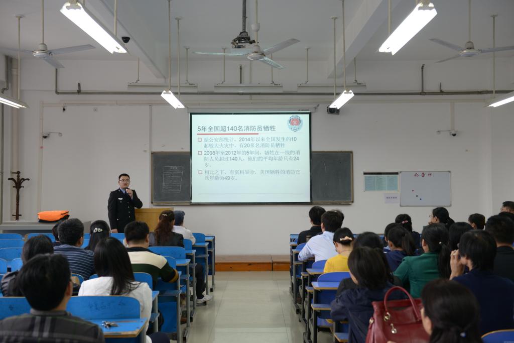为促进每一位教师更深入地学习消防安全知识,牢固树立消防安全意识,并具备一定自救能力,2015年10月13日下午,基础医学院特邀郑州市公安消防支队李林峰警官,为教职工作“人人参与消防,共创平安和谐”的消防安全知识普及专题讲座。