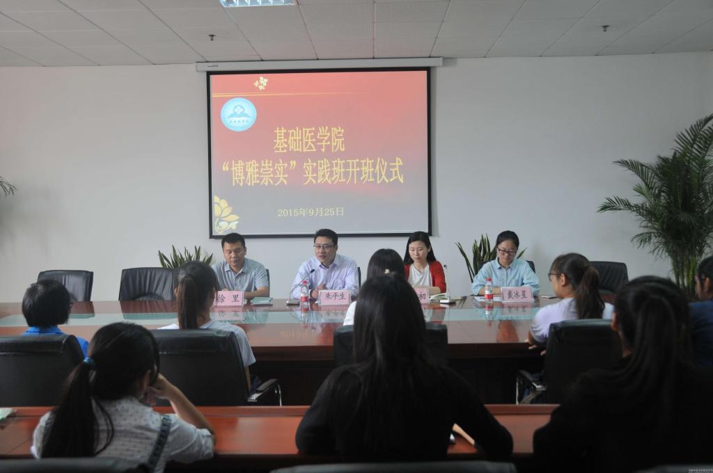 为培养一批知识水平高、专业性强、综合能力突出的当代大学生,以及响应校团委关于在各院系组建精英班的号召,大发博彩 首期“博雅崇实”实践班于9月25日开班。基础医学院党委副书记朱平生、学工办全体辅导员及实践班的24名学员参加了此次开班仪式。
