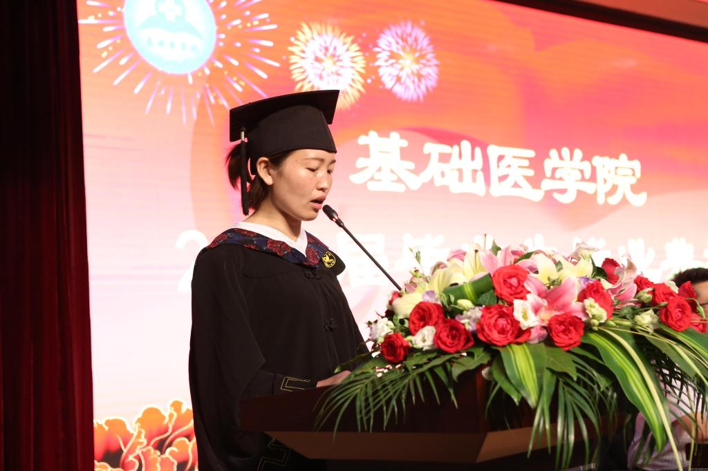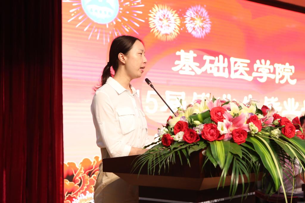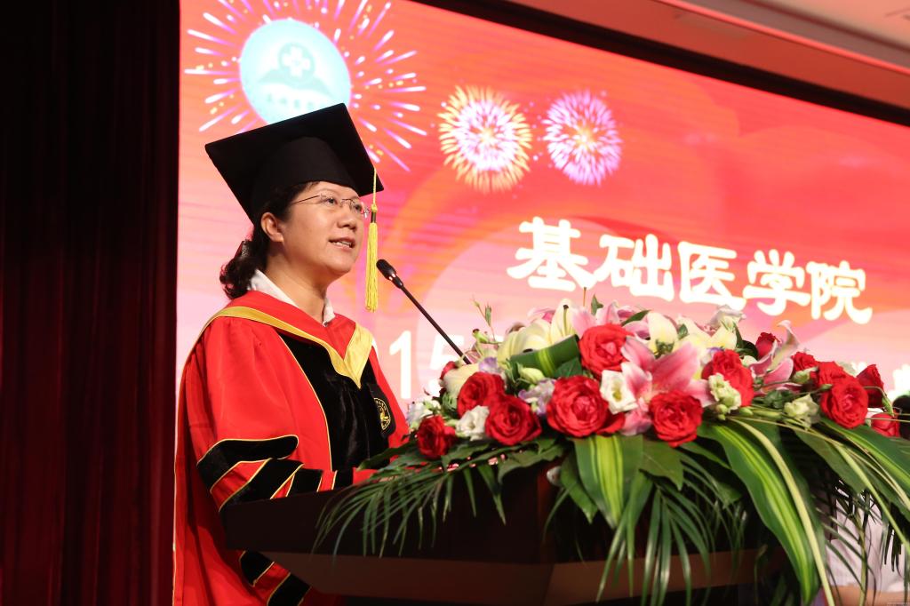 仪式在庄严肃穆的国歌声中拉开序幕。首先,基础医学院院长詹向红教授做了热情洋溢的讲话。她对2015届毕业生在校期间的取得的诸多成绩及荣誉,以及同学们在成长过程中所表现出的坚毅品质,形成的良好班风、学风和优异成绩给予了充分的肯定与赞誉,对同学们顺利完成学业表示祝贺,在同学们未来生活上,詹院长分别从 “诚信、感恩、追求、坚定”四个方面提出了希望与祝愿。同时她希望每位学子在与母校告别后,要常回家看看,勿忘恩师,保持联系,让母校及老师能及时了解毕业生们的成长和进步,做同学们最坚实的后盾。