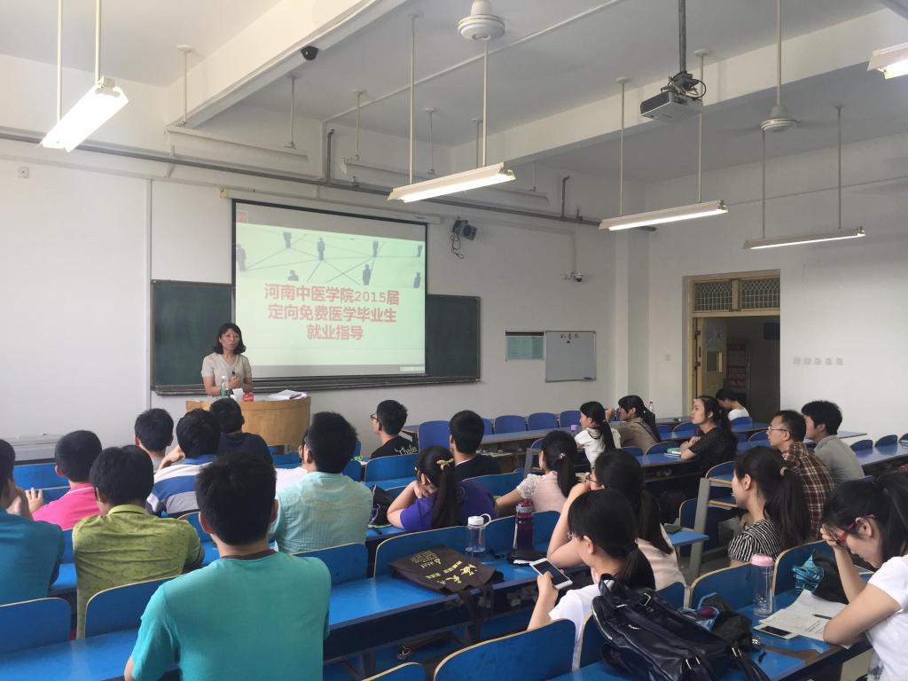 6月5日下午,基础医学院学工办在教学楼405教室举行了2015届中西医临床医学(农村全科医师)专业定向免费医学毕业生就业指导会,毕业班辅导员、全体定向生到场参加。培训会特邀我校招生就业处刁青蕊副处长就定向生毕业履行合约注意事项以及做住院医师规范培训相关政策进行政策解读。