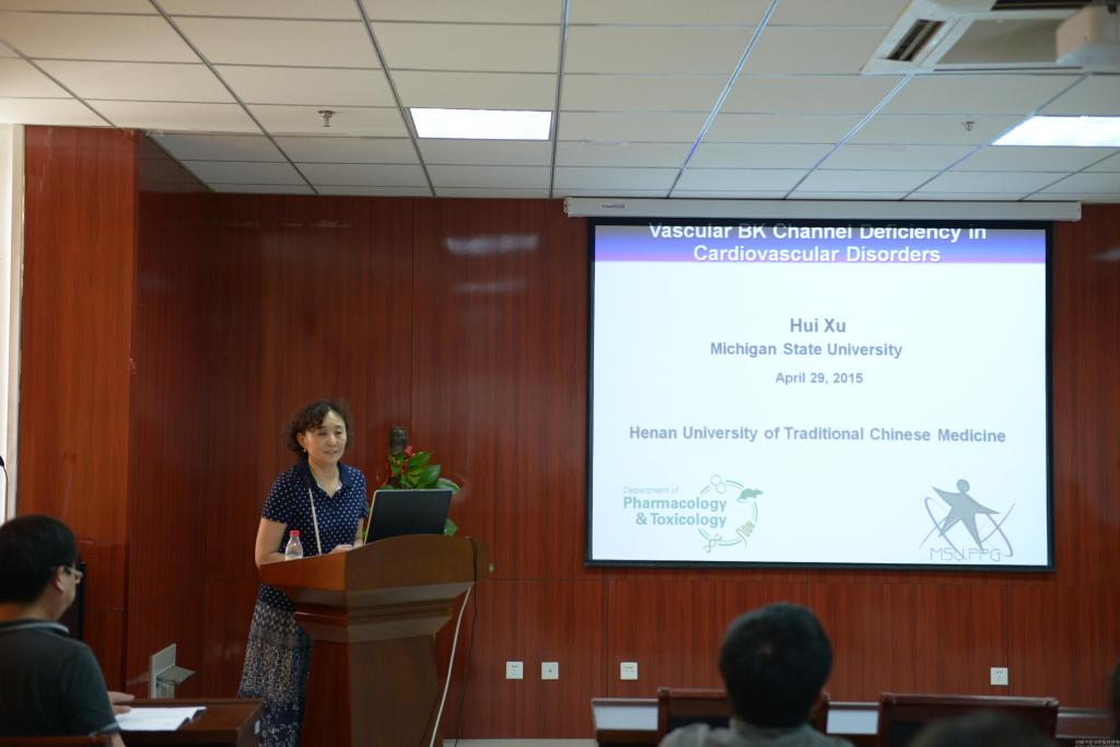 2015年4月29日下午3点,美国密执根州立大学药理毒理系徐晖博士应邀为我校第六届大发文化节暨百家论坛作学术讲座,基础医学院教师及研究生代表80余人到场聆听了讲座,讲座由基础医学院高剑峰副院长主持。