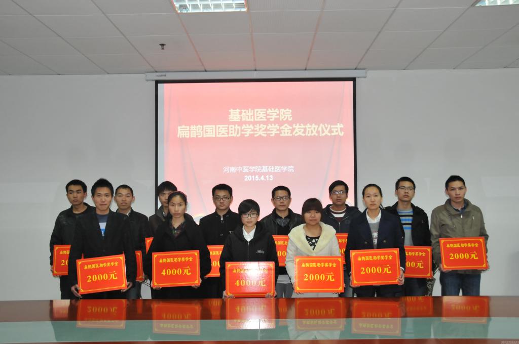 4月13日晚,基础医学院学工办举行2014年“扁鹊国医助学奖学金”发放仪式。基础医学院学工办全体辅导员、13名获奖学生及部分学生代表参加。仪式由基础医学院大学生资助专员孙慧娟老师主持。