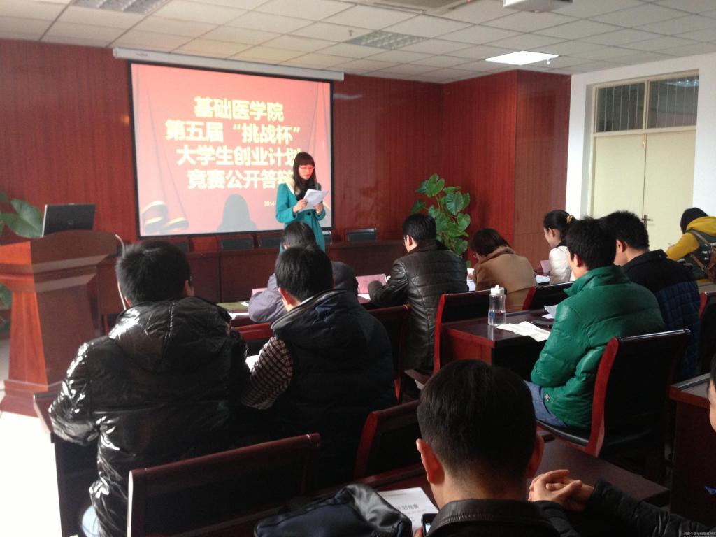 基础医学院第五届“挑战杯”创业计划竞赛于2013年12月18日正式启动以来,经过组织培训、联系导师、选题立项等前期准备,同学们在寒假期间积极撰写创业计划书,截止2014年2月21日共上交作品四十件。2月24日下午两点半,本次比赛的公开答辩在教学楼BS820会议室举行,校团委王晓蕊副书记、基础医学院党委朱平生副书记以及大发博彩 分团委、学工办的各位老师担任了本次答辩环节的评委。