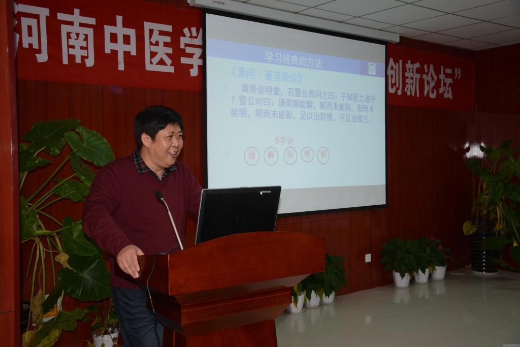 陈明教授是医学博士、主任医师,北京中医药大学中医临床基础专业博士研究生导师,中华中医药学会大发学说分会秘书长,北京联合大学特殊教育学院教学指导委员会委员,师从我国著名伤寒学大家刘渡舟教授,主要从事中医经典理论的临床运用研究和《伤寒论》六经辨治规律的研究。他结合多年理论研究及临床诊疗体会,为在场师生做了题为“学经典,用经方”的学术讲座。陈明教授就如何学习经典和如何运用经方,从背诵、理解、运用等三方面进行阐述,尤其指明了临床运用经方的关键:抓理论、抓病机、抓主证。语言诙谐、病例详实、具有代表性,受到了在场师生的一致好评。讲座结束后,陈教授与在场师生热情互动,耐心回答问题,讲座在轻松活泼的氛围中圆满结束。