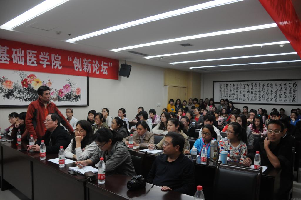 2013年10月28日下午,应基础医学院国家中医药管理局重点学科中医预防医学学科邀请,华中科技大学同济医学院公共卫生学院副院长刘烈刚教授做客我校重点学科学术讲座暨基础医学院创新论坛。我校刘文第副院长亲切会见了刘教授,并代表学校表示热烈欢迎。刘烈刚教授为我校师生做了题为“铁负荷与2型糖尿病”的专题讲座。郑州大学公共卫生学院营养教研室主任韩萍教授、我校中医预防医学学科带头人申杰教授、学科教师和学生代表100余人聆听了讲座,讲座由基础医学院高剑峰副院长主持。
