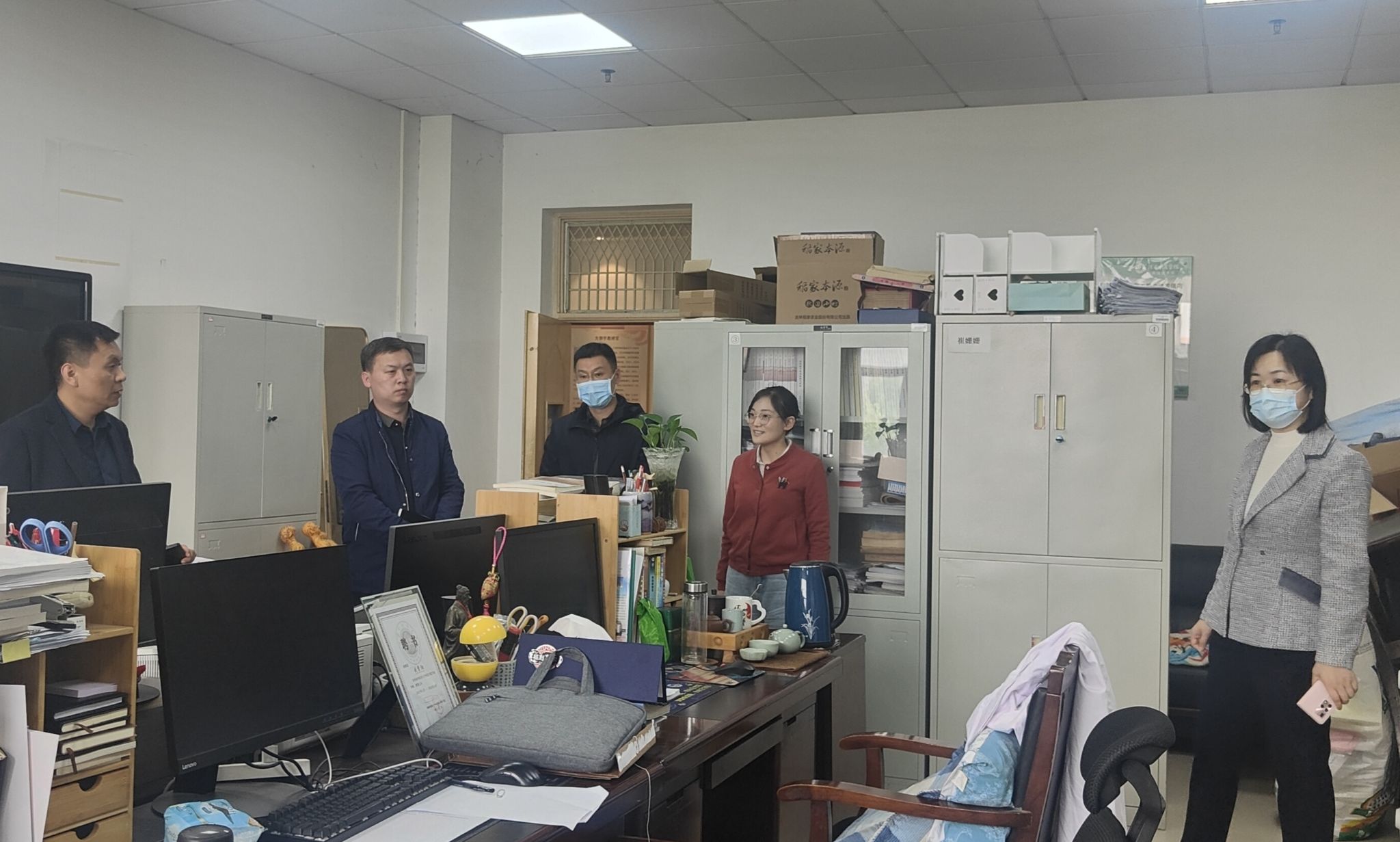期间,领导走访全体科室,重点了解教师对办公环境意见建议、假期安排,以及试卷集中存放搬迁进度;查看办公室门窗、电源使用情况,以及现有人数及办公用面积匹配情况;嘱咐教师离开办公室务必确保门窗、电源关闭,注意假期出行及居家安全,预祝教师度过一个安全欢乐的假期。