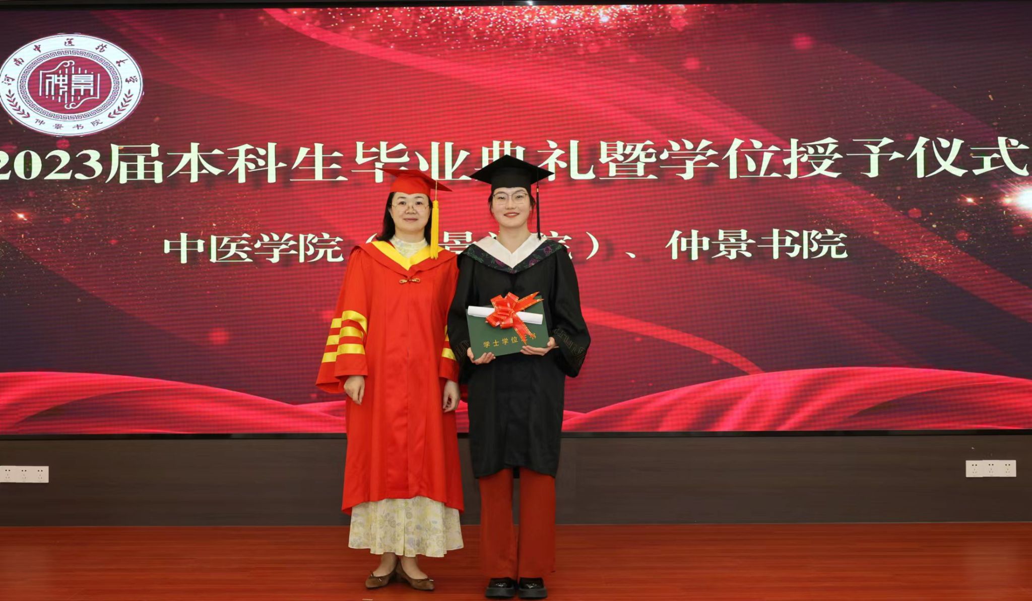 仪式在雄壮的国歌声中拉开帷幕。李宁宣布2023届毕业生“五个一”主题教育活动“我最喜爱的老师”评选结果,毕业生代表向“我最喜爱的老师”献花、行谢师礼。副院长刘文礼宣读河南中医药大学第十一届学位委员会关于2023年本科毕业生授予学士学位的决定。