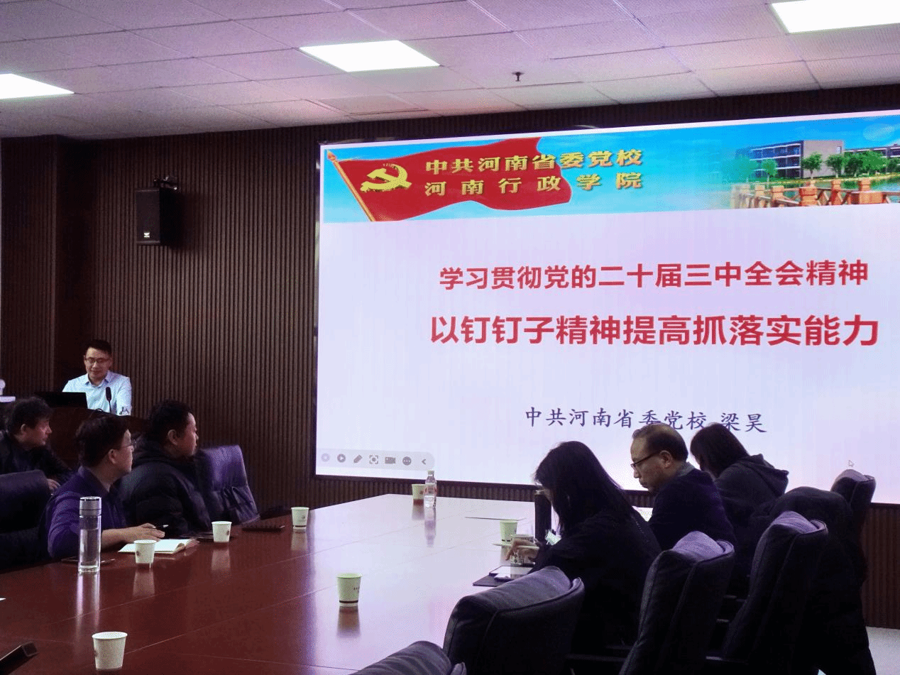 本网讯(文/宋丹萍 图/古豫蕾)为深入贯彻落实党的二十届三中全会精神,2024年12月3日,大发博彩官网 邀请中共河南省委党校梁昊副教授做了《学习贯彻党的二十届三中全会精神-以钉钉子精神提高抓落实能力》的专题讲座,学院领导班子及各支部委员会成员到场聆听学习,讲座由学院党委书记袁晓宇主持。
