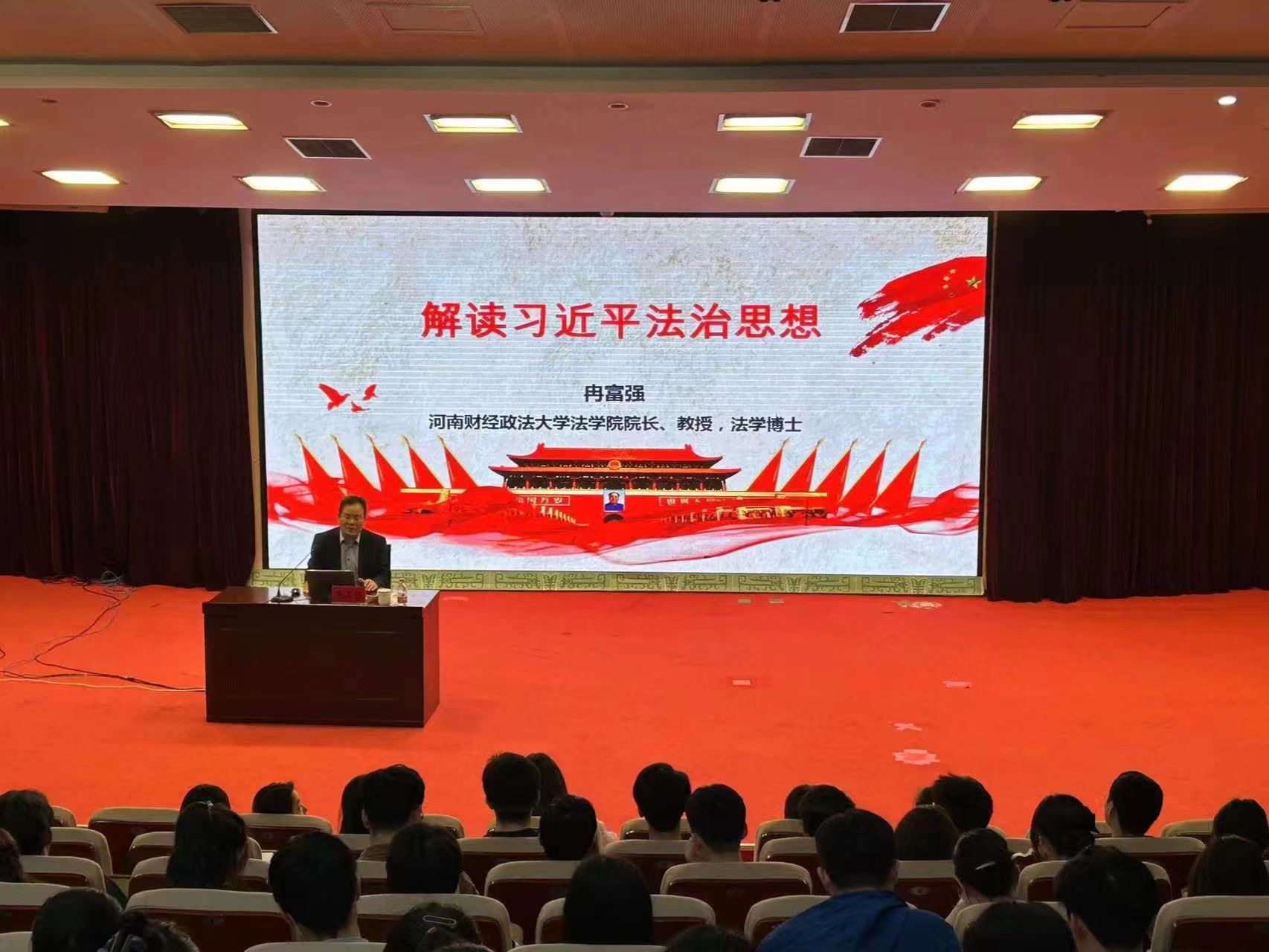 本网讯(文/图 赵申苒)为持续深入宣传贯彻党的二十大精神,系统学习习近平法治思想,提高师生法治素养,大发博彩官网 于2023年4月19日下午在校图书馆第一报告厅开展专题辅导报告。本次讲座特邀河南财经政法大学法学院院长、教授、法学博士冉富强主讲,大发博彩官网 师生党员代表300余人参与学习。学院副院长李宁主持。