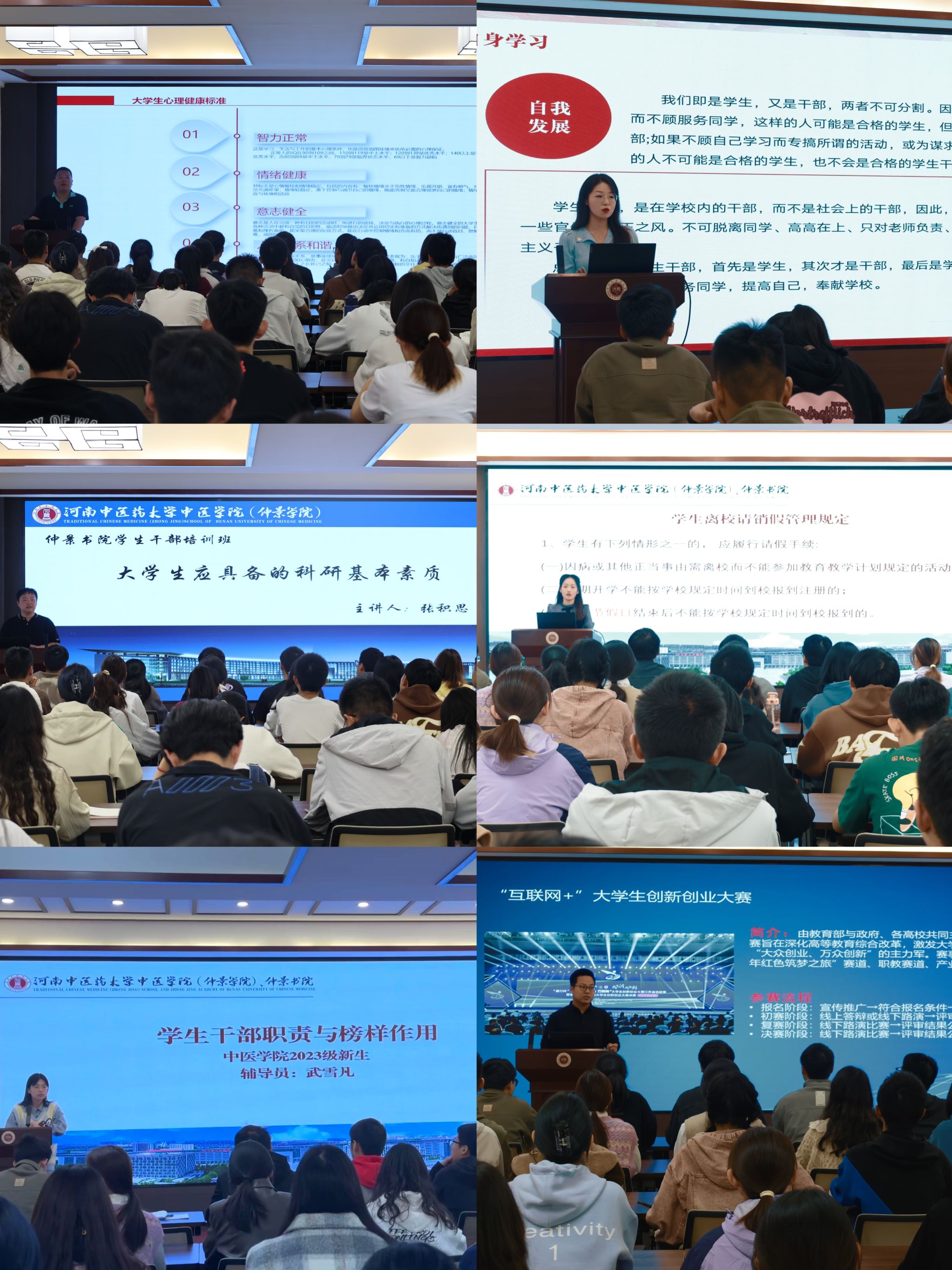 在《如何做一名合格的学生干部》主题培训中,王宁老师以学生干部的自我身份认知为切入点,从“正其身、立其行、践其思、端其心”四个方面具体讲述了如何成为一名合格的学生干部,引导同学们要慎思笃行,臻于至善;吴明明老师以大学生科研赛事以及立项科普为主题,分别从赛事类别,赛事赛道,赛事荣誉以及参与途径四个方面进行讲解,并结合具体实例进行分析,提出“想法要天马行空,做法要脚踏实地”,引导同学们敢于参赛,积极参赛。