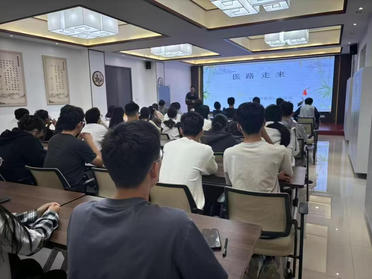 张佳乐老师以“医路走来”为主题,围绕读书工作经历,以中医思维、行医见闻、医案分享及学长寄语五大模块展开讲座。首先,张老师指出,中医作为中华民族的瑰宝,承载着千年的智慧和实践经验,而中医思维是中医的灵魂所在。其中阴阳五行学说的理论犹如基石,阴阳的平衡与转化,五行的相生相克,诠释了生命的动态变化和相互关系,蕴含着对宇宙万物运行规律的洞察。接下来,张老师通过讲述下乡诊治的行医见闻和医案分享,鼓励同学们积极参与到乡村志愿服务中去,既能增进大家对基层医疗现状的了解与体会,提升个人的社会责任感,又可以运用所学专业知识为乡村居民带去健康与希望,实现自我价值与成长。讲座最后,张老师为同学们送上临别寄语,“上以疗君亲之疾,下以救贫贱之厄,中身长全,以养其生。”此次活动现场气氛热烈,同学们感悟良多。