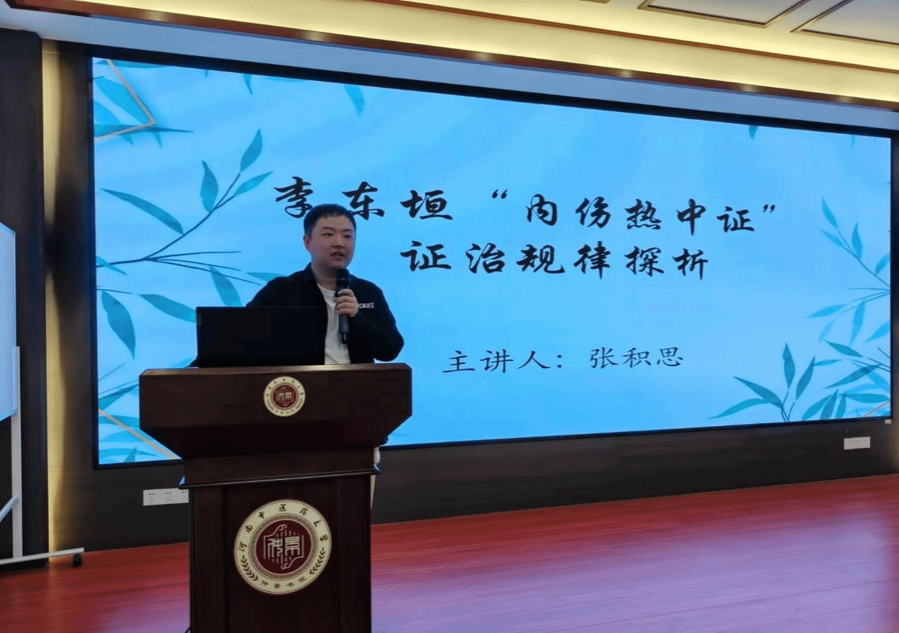 张积思老师以“李东垣‘内伤热中证’证治规律探析”为题,从自身学医经历入手,提出中医理论虽深奥但也朴素,鼓励同学们克服畏难情绪,建立学医信心。首先,张积思老师介绍了李杲的生平和脾胃学说,阐释了内伤热中证实质为气虚发热。接下来,张积思老师又通过分析《内外伤辨惑论》原文,为同学们理清了内伤热中证的病因病机,同时分享对命门、胞宫的见解。最后,张老师强调此证宜用补中益气汤来治疗,此方可温阳化气,用以治疗气虚证。在讲座的结尾,张老师对同学们寄予“健康所系,性命相托。指尖上的艺术,跳动着的生命,谨以一生追求的使命”之厚望。张积思老师的讲解通俗易懂,幽默风趣。本场讲座反响热烈,学习氛围浓厚。