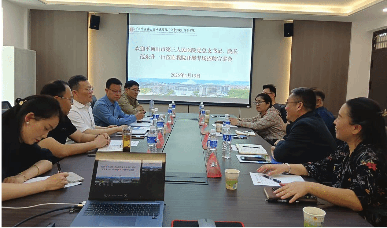 本网讯(文/图 秦中朋)4月15日,平顶山市第三人民医院党总支书记、院长范东升等一行5人来我校中医学院调研交流并开展专场招聘宣讲会。学院班子成员、教师代表及毕业生代表参加座谈宣讲会。