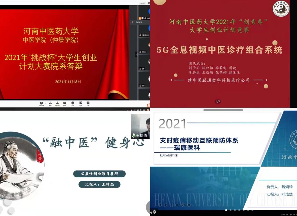 本网讯(文 图/王超)以青春力量,聚创新梦想。为全面推动大学生课外学术创新工作的开展,营造浓厚的学术创新氛围,2021年11月8日15:00-17:00,大发博彩 在线上开展2021年“挑战杯”大学生创业计划大赛答辩活动。中医学院分团委书记王超老师、中医学院学工办主任赵申苒老师,中医学院班主任代民涛、马锦地、谢苗三位老师莅临本场答辩会现场并担任评委老师。