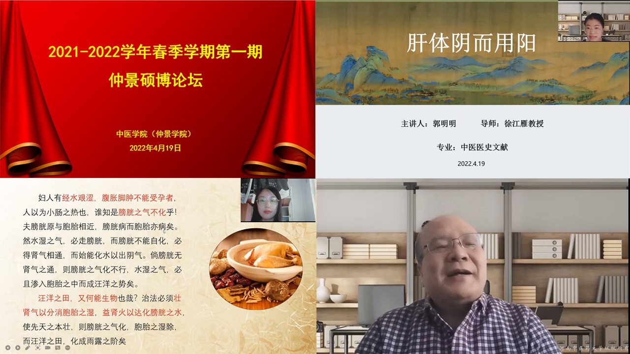 2020级博士研究生许晓娜讲述了从脾胃论治新冠肺炎的理论和机制研究进展;2020级硕士研究生李少康述了中医诊断学之“预测法”的探究;2020级硕士研究生郭明明讲述了肝体阴而用阳;2021级硕士研究生王晨阳分享了关于厥阴病的心得体会;2021级硕士研究生李丹丹分享了从种子发芽论不孕不育的理念。