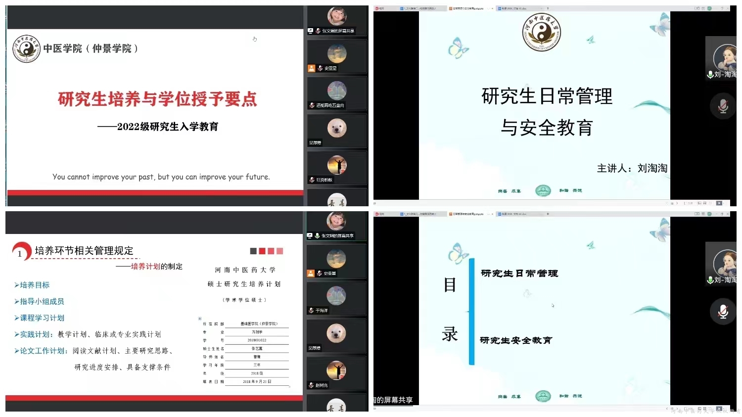 学院学工办副主任刘淘淘从研究生日常管理、校园安全教育、资助政策两个方面,带领大家认真研读《河南中医药大学研究生手册》,强调了同学们返校后的校园疫情防控政策及相关校规校纪;引导大家学习正确的宗教理论政策知识,树立正确宗教观;叮嘱大家要严密防范网络电信诈骗,并普及了相关防范措施。