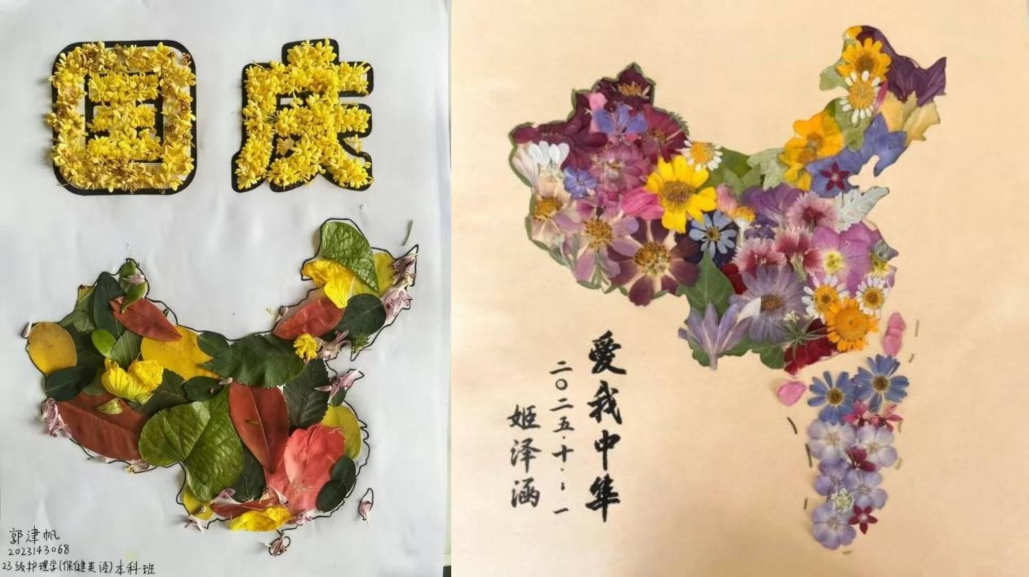 暂别教室的喧嚣,同学们踏入自然的怀抱,化身“自然收藏家”,开启一场与秋叶的浪漫邂逅。以秋叶为创作载体,寻觅形态、色彩、纹理各异的树叶,经压平、干燥等压花基础工序精心处理后,通过拼贴、组合等手法展开艺术创作,使自然素材与爱国情怀碰撞出奇妙火花。压花定型时的专注、拼贴构图时的巧思,不仅让同学们领略到传统手工技艺的独特韵味,更在实践中锤炼了观察力、想象力与动手能力。创作中,同学们将长城、国旗等元素融入画面,直观展现对祖国的礼赞;借山水、繁花等意境,传递对祖国繁荣昌盛的祝福。每一幅作品,都凝结着同学们对祖国的深情热爱与美好祝愿,定格成永恒的记忆。